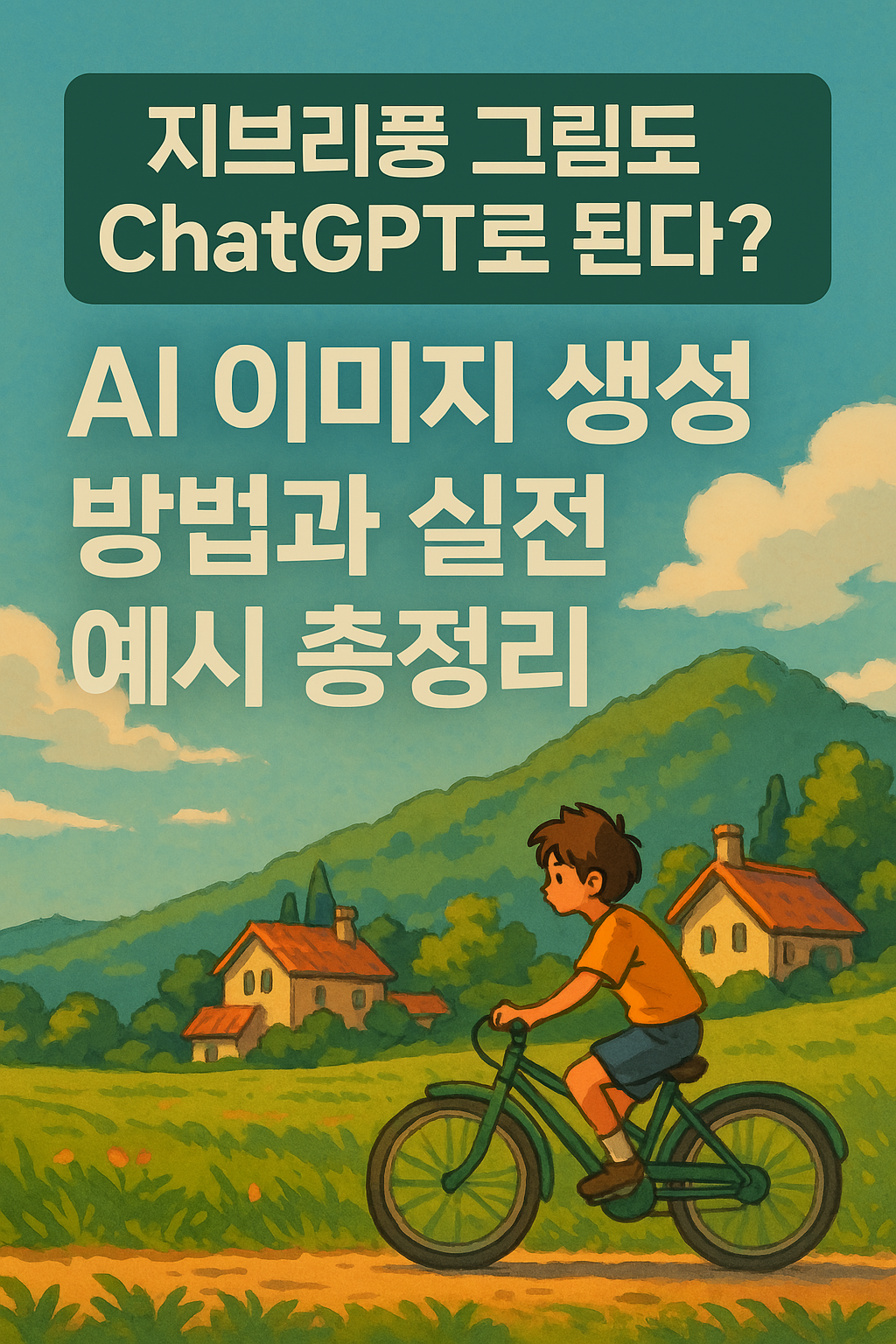 “지브리 애니메이션 스타일로, 언덕 위 작은 마을과 푸른 하늘을 배경으로 자전거를 타는 소년을 그려줘. 따뜻한 색감으로, 16:9 비율로 만들어줘.”